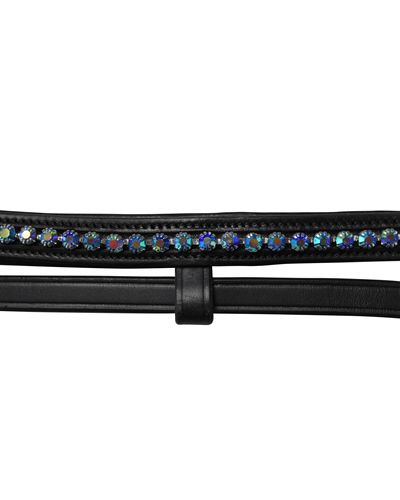 Extravagantes, englisch-kombiniertes, weich gepolstertes Sperrhalfter. Verziert mit einer Reihe regenbogenfarbender "Schmuckdiamanten, passend zum Kopfstück "Rainbow", sowie zu allen anderen Hilbar Kopfstücken.
